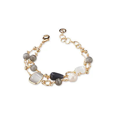 Bracciale da donna di Sovrani della collezione Cristal Magique. Bracciale in ottone con finitura in oro con cristalli occhio di gatto grigio e bianco, selenite e perla di fiume. Lunghezza: cm 19+3. Chiusura a moschettone. La referenza è: J10029