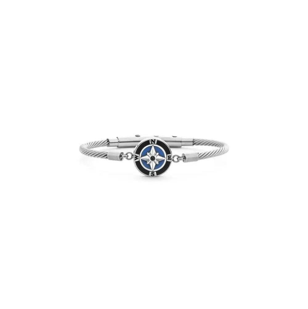 Il bracciale presenta un design a cavo intrecciato in acciaio che conferisce un aspetto robusto e contemporaneo. Il dettaglio centrale è una bussola smaltata in blu e nero con i punti cardinali ben visibili, simbolo di avventura e orientamento.