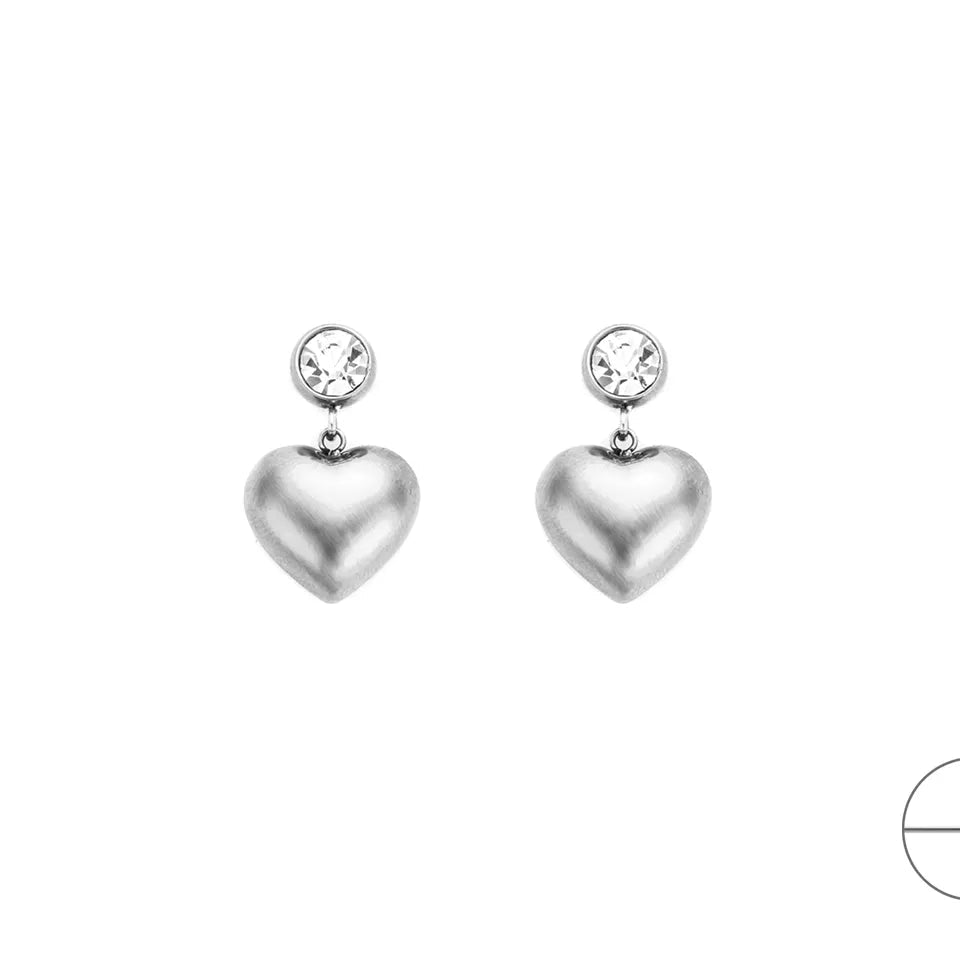 Questi orecchini sono realizzati in Acciaio (come visibile nel modello in foto, con finitura color argento). Presentano un punto luce superiore con Zircone Bianco incastonato, dal quale pende un cuore bombato in acciaio lucido/satinato. La chiusura è a perno e farfallina.