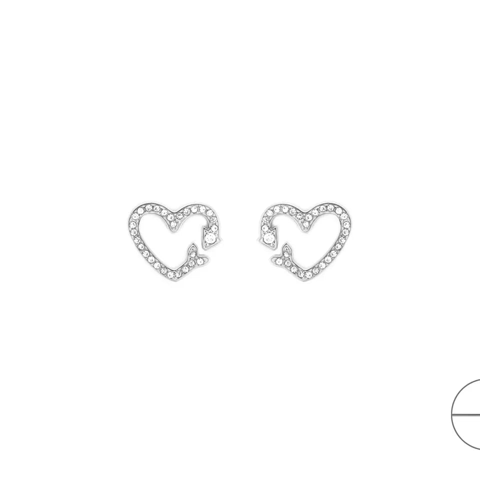 Questi orecchini sono di modello a lobo (come visibile nel modello in foto, con chiusura a perno). Sono realizzati in Acciaio Inossidabile (con finitura color argento). Il design è a forma di cuore traforato/scomposto, interamente impreziosito da un pavé di Zirconi Bianchi che catturano la luce. La chiusura è a perno e farfallina.
