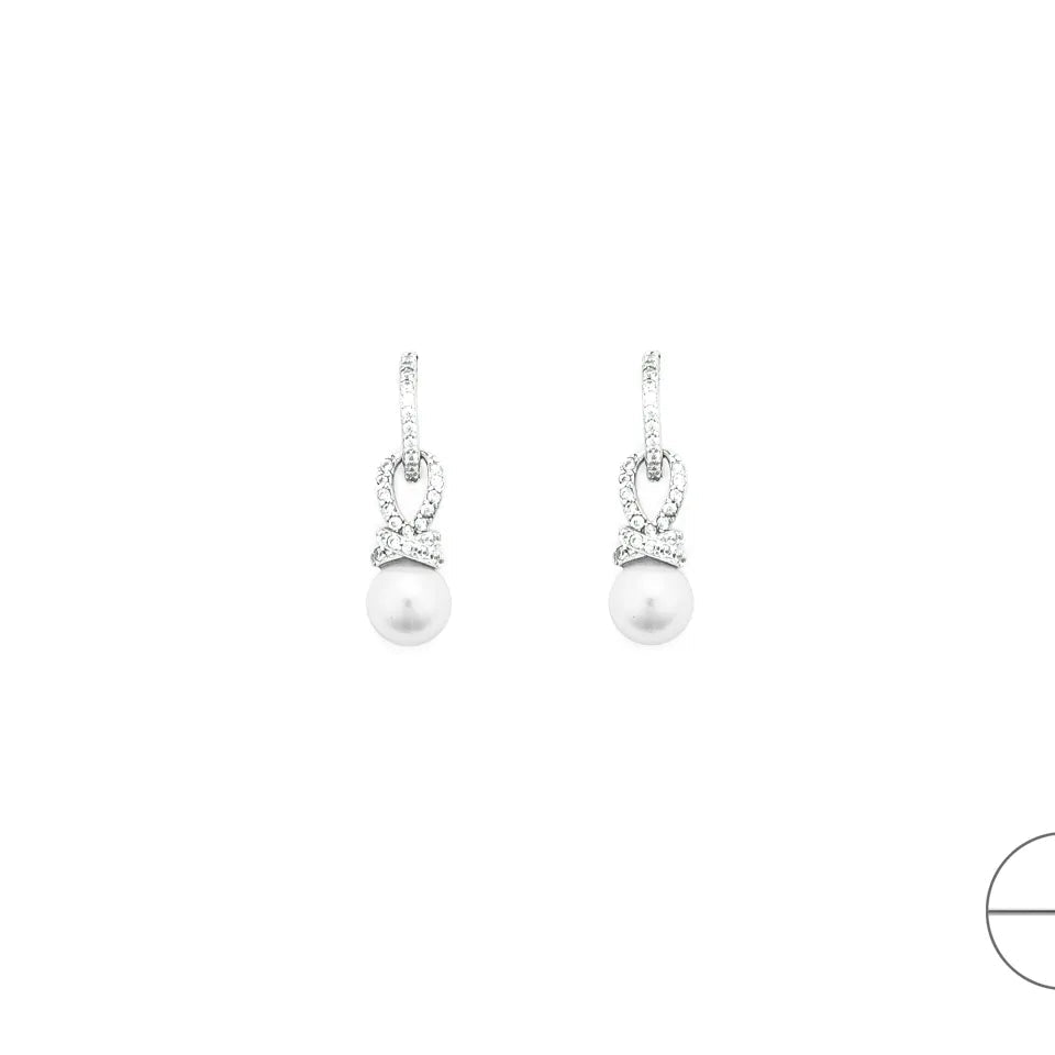 Questi orecchini sono di modello pendente e sono realizzati in Argento (come specificato nella Collezione San Valentino 25 in Argento). La parte superiore, che si fissa al lobo, è un elemento curvo/a fiocco interamente impreziosito da Zirconi Bianchi. Da questo pendono, in modo aggraziato, una Perla di circa 6mm di diametro (come da descrizione fornita) e di colore bianco lucido. La chiusura è a perno e farfallina.