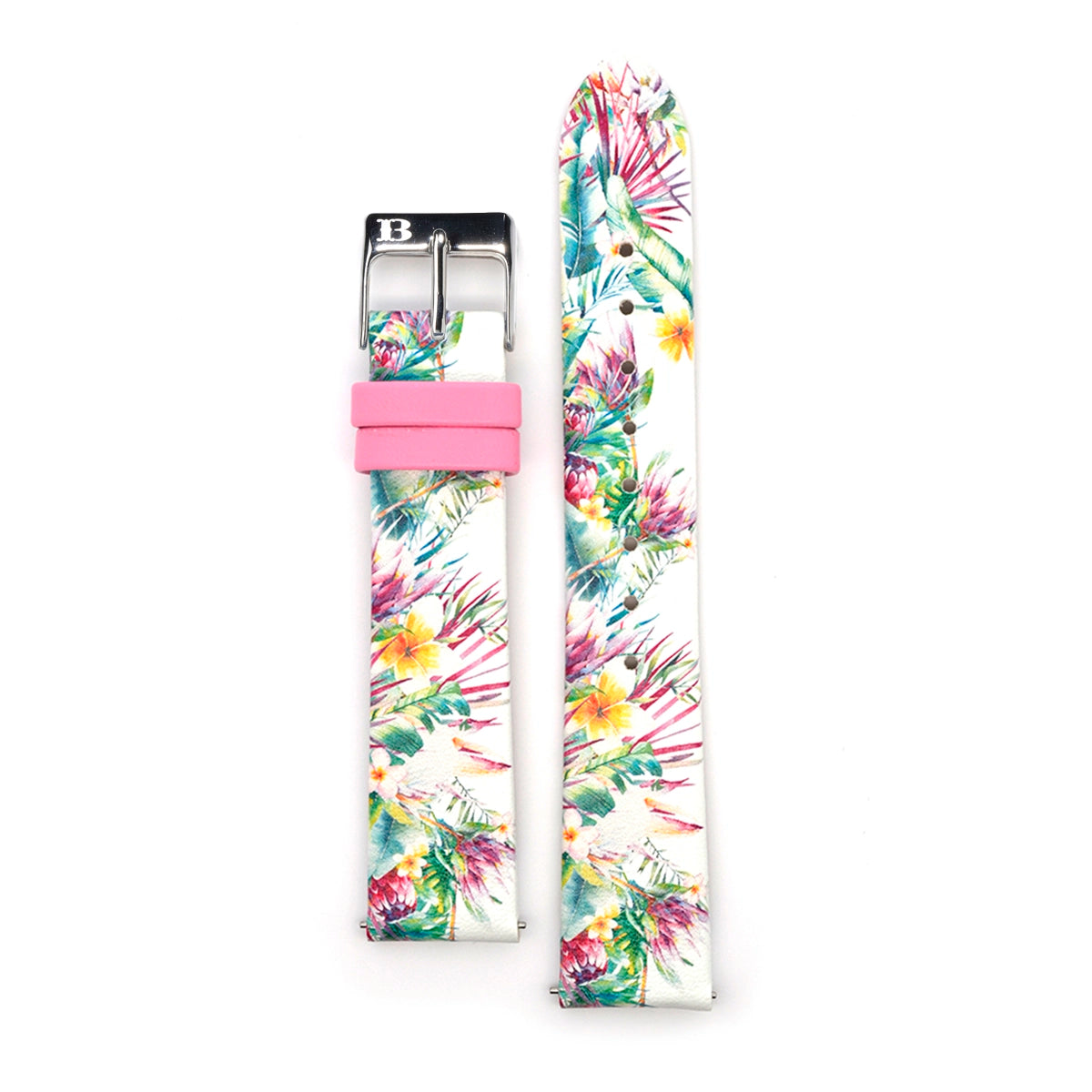 Immergiti in un'atmosfera paradisiaca. L'orologio Onda Tropicale, con il suo motivo tropicale, ricco di dettagli e colori, si adatta a ogni stile. Il cinturino, un foulard leggero e avvolgente, completa l'opera, trasformando il tuo orologio in un accessorio unico. Riceverai un ulteriore cinturino di ricambio per poter abbinare il tuo orologio ad ogni stile.